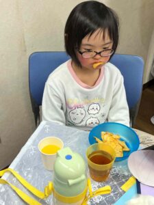 オレンジジュースで乾杯してケーキとポテトチップスのどちらかを