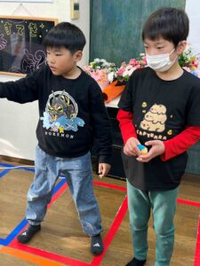 2人は20秒間お手玉をかごに投げて、入らなかったお手玉を
