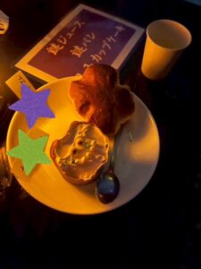 注文すると「おまたせしました!」と可愛い目玉マフィンと焼きたてパン、謎ジュースが運ばれてきました!!