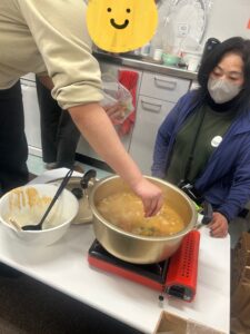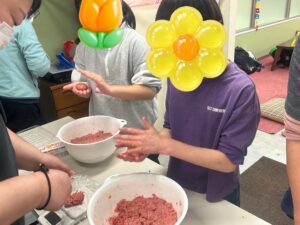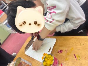 本日は明日行われるクリスマス会に向けて、チームに分かれてフルーツポンチ、からあげ、ハンバーグ、豚汁、たこさんウィンナーの仕込みを行いました。